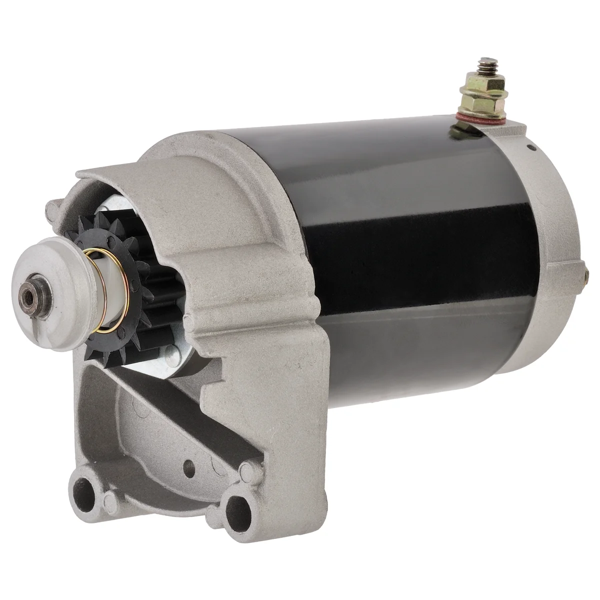 Briggs & S. Starter motor 497596, 16k 12V, 16k, CCW End cover (Case) L-102 mm. Fits: Briggs & Startton 2 cylinder (all except Vanguard series) 14, 16, 18 HP engines. Starter motor 91-057-4808 resembles fixed but has a shorter end cover L-89 mm.